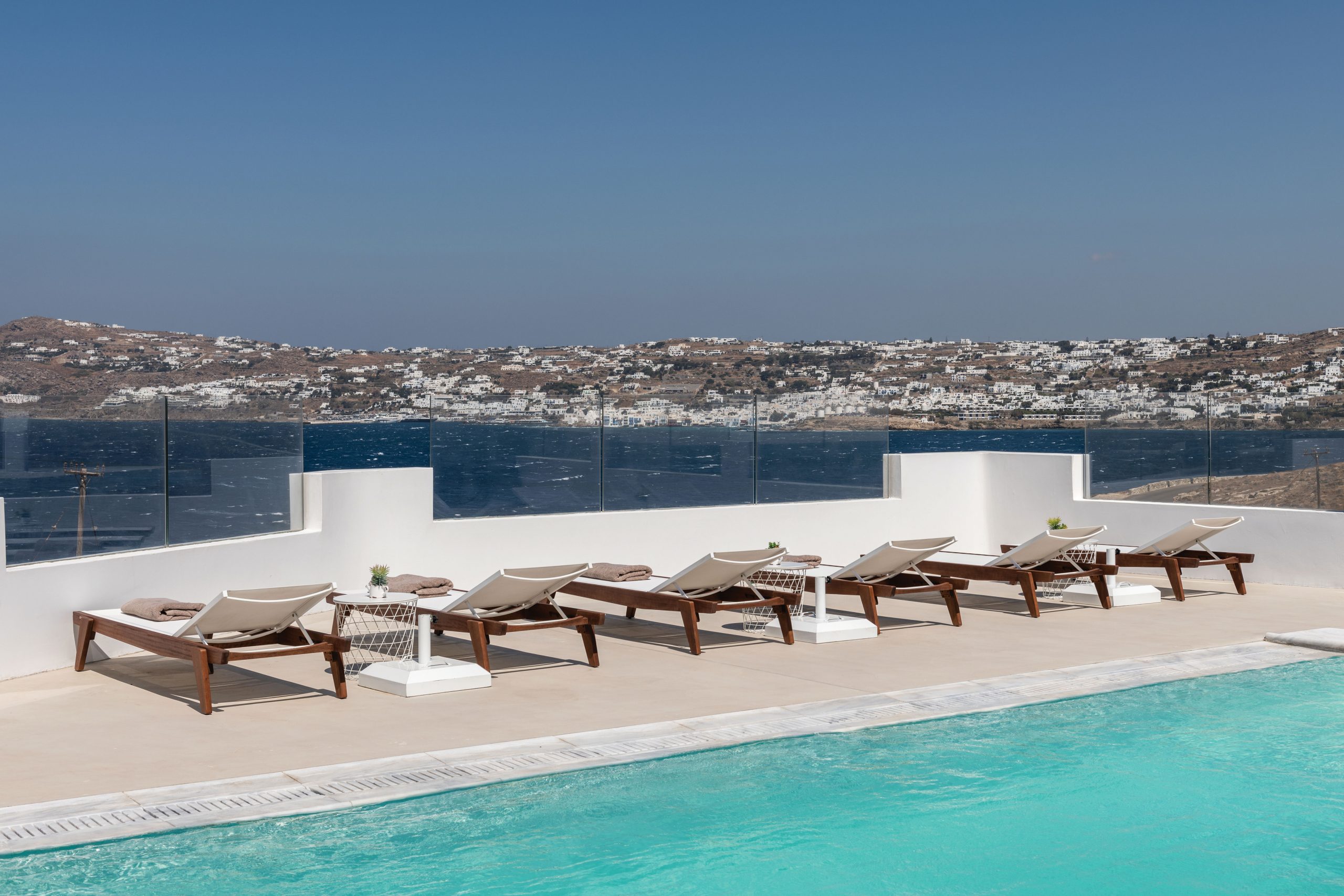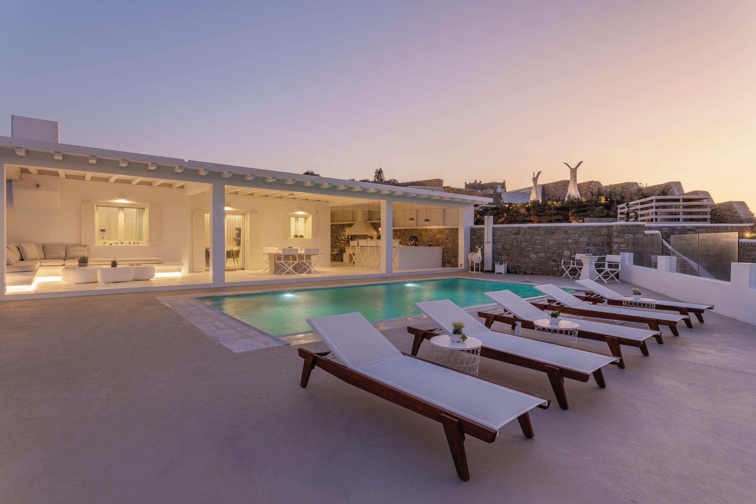 Just in front of the covered area is the sun-drenched pool and outdoor deck. The lower level terrace offers a more secluded and relaxed experience with direct access to the curated gardens. Set on a sloping plot measuring 1.341 sq.m., the outdoor areas benefit from magnificent views of the Aegean waters, the city of Mykonos and the little island of Baos with the picturesque chapel of St.George.
